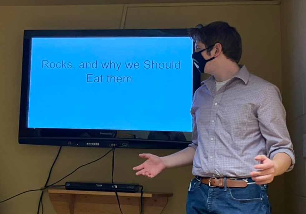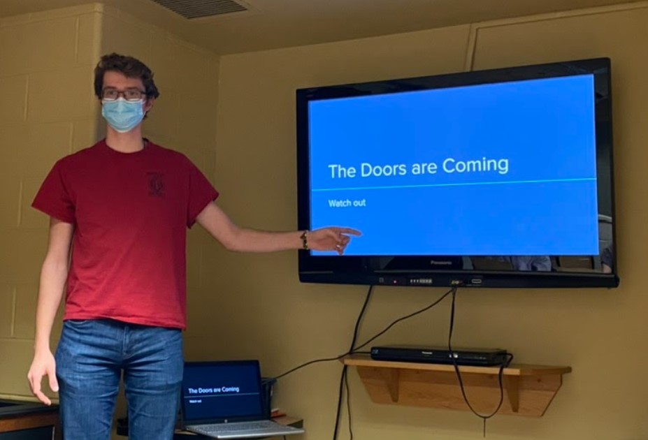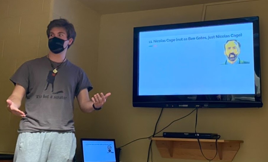 Jack presented the first of multiple memorable presentations on Wednesday night. He cautioned us that doors were coming to take over the country and walked us through a suspenseful story that ended in complete tragedy. The doors succeeded in overthrowing the government and he did a wonderful job of narrating the story of devastation. Charles presented in a similar fashion to Jack, but offered us a solution for sadness: eating rocks. All for jokes (please don’t actually eat rocks), Charles explained that his friend was feeling bored and sad from eating the same old meals. But adding rocks to his food turned his frown upside down, quite literally thanks to some photoshop from Charles. For Dylan’s presentation on the Top 10 Hottest NFL Mascots, Viktor the Viking, Sourdough Sam, and Sir Saint made the rankings, as well as Aaron Rodgers (representing State Farm), who was number five. The winner was Boltman of the San Diego Chargers. Lastly, Logan A. presented the Worst Disney Villains. Of course, his list included Frollo from The Hunchback of Notre Dame, Scar from The Lion King, and Cruella DeVille from 101 Dalmatians, but it didn’t take long for his presentation to become quite surprising. Logan presented some characters we’re not familiar with calling villains like Jessie from Toy Story, for being “too southern,” Mary Poppins, for flying without a Pilot’s License (which could result in a prison sentence), and Lightning McQueen, for being mean to Mater.