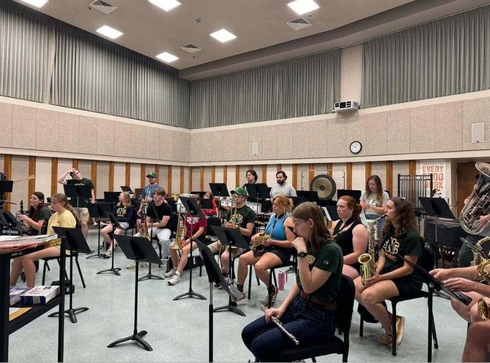 The SNC pep band practices once a week for 2 hours, which is a change from her high school experience, where marching band meetings were more frequent, meeting three times a week. The pep band had a successful first semester, performing at volleyball, football, and basketball games.